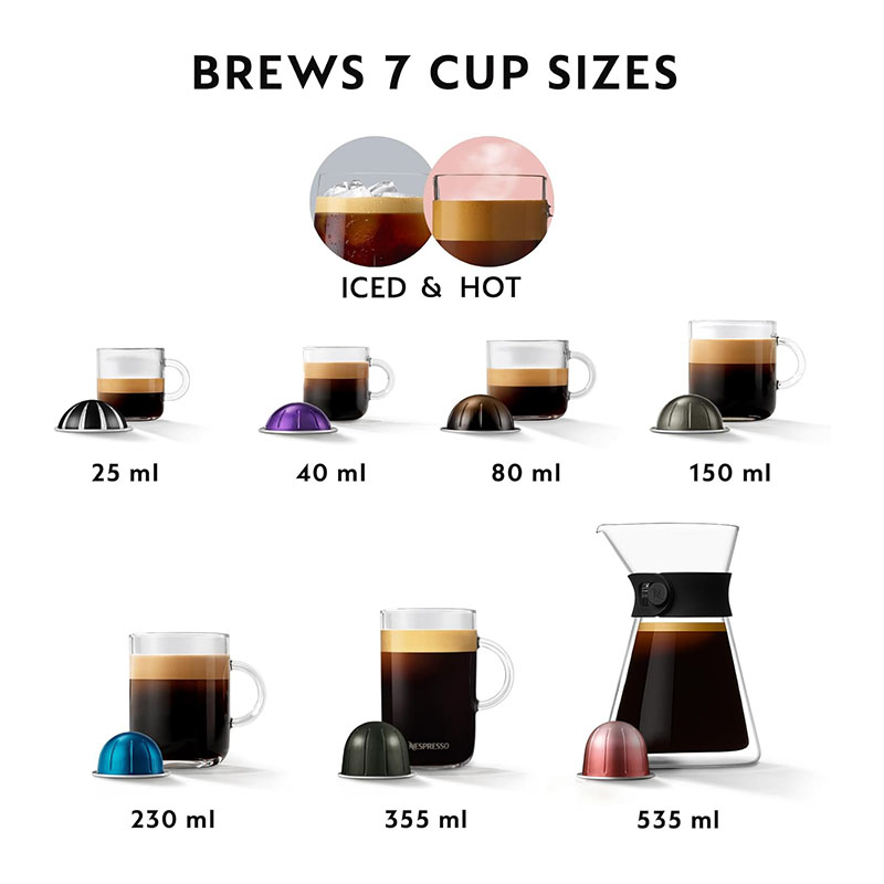 Five cup sizes: Espresso (40ml), Double Espresso (80ml), Gran Lungo (150ml), Mug (230ml), Carafe (535ml).